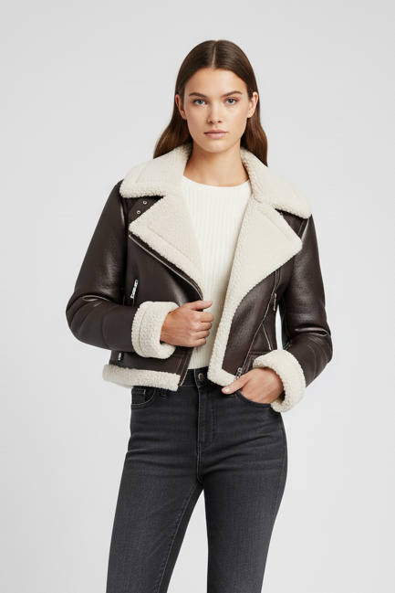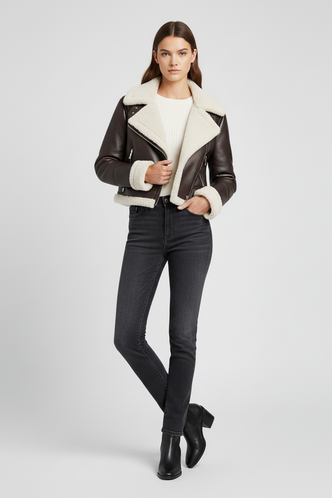Perfect for tailored trousers, midi skirts, and winter boots, this cropped shearling jacket becomes a statement layer for both casual and upscale looks.
