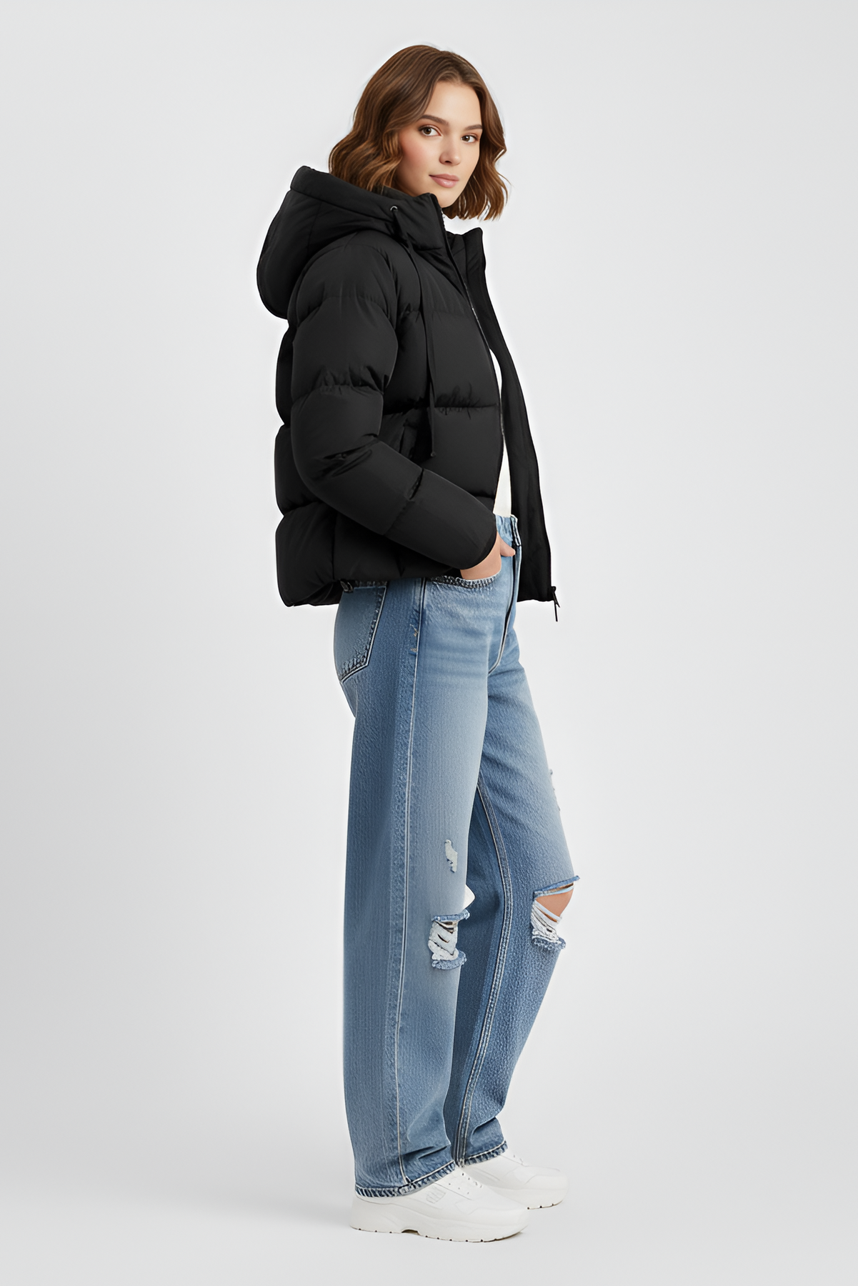 Filled with premium polyester insulation, the coat provides cozy protection without weighing you down. Its soft woven shell keeps you warm on chilly days while remaining breathable and easy to move in. A high-collar hood shields from wind and cold, while the smooth front zipper and discreet side pockets combine utility with sleek minimalism.