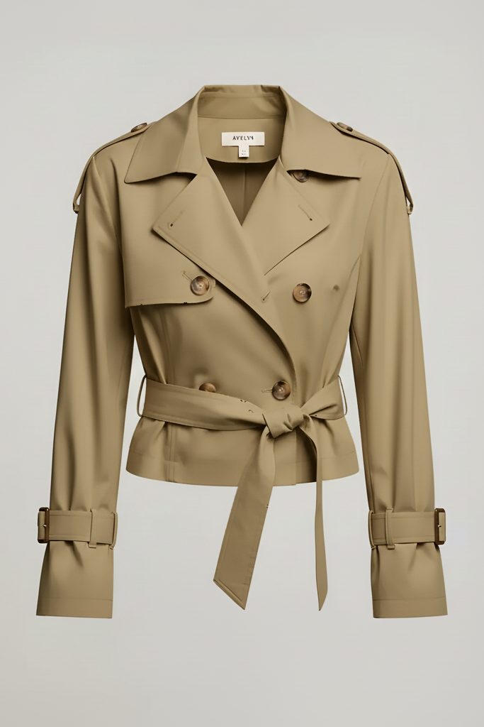 The AVELYN Double Breasted Trench Jacket captures the elegance of classic tailoring in a modern cropped cut. Designed for women who embrace light sophistication, this short trench combines structure and comfort with a breathable woven fabric that moves effortlessly through every season.