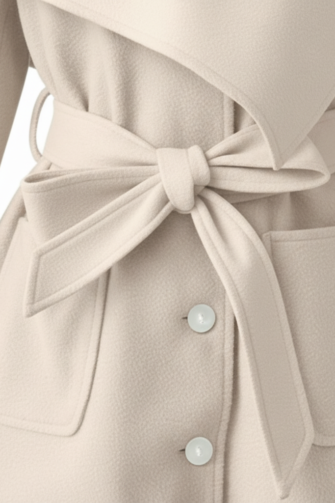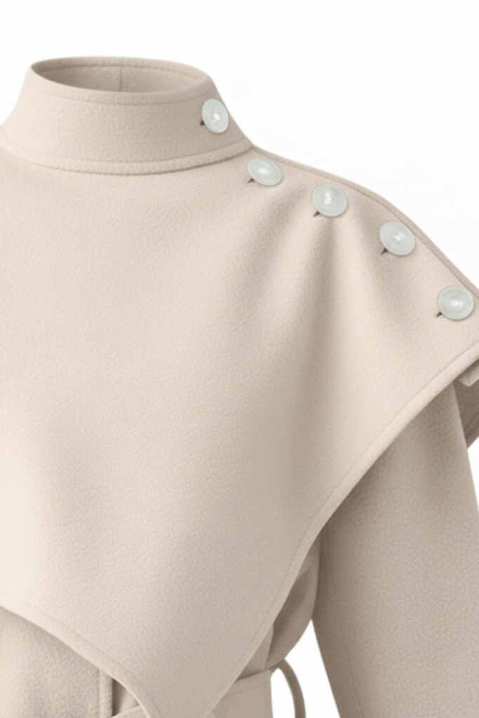 Confectionné dans un mélange de laine lisse d'un beige raffiné, le manteau Elena présente un col montant qui lui confère une allure architecturale et moderne. Sa fermeture à un bouton et sa ceinture intégrée soulignent délicatement la taille, tandis que sa coupe ample permet de superposer les vêtements confortablement. Les manches chauve-souris apportent fluidité et mouvement, créant une silhouette contemporaine à la fois élégante et facile à porter.