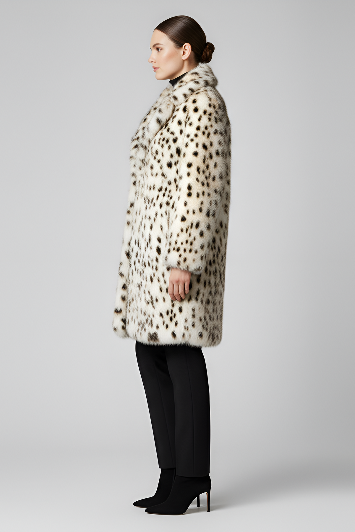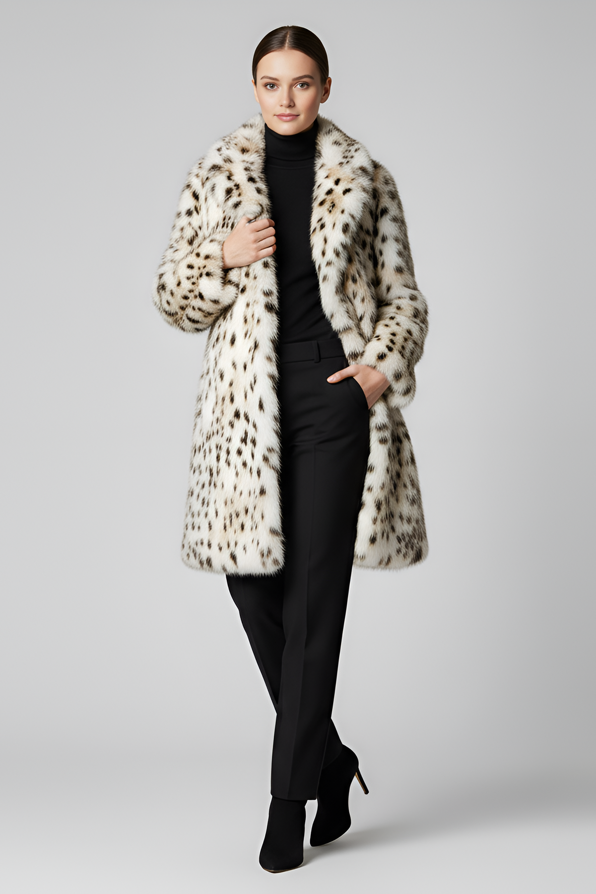 The regular-length silhouette drapes naturally over the body, offering comfort and effortless layering. The turn-down collar adds a touch of timeless sophistication, while the breathable construction ensures comfort during cold-weather outings. With its plush faux fur texture and eye-catching print, LEOVARA transforms any winter look into a standout moment.