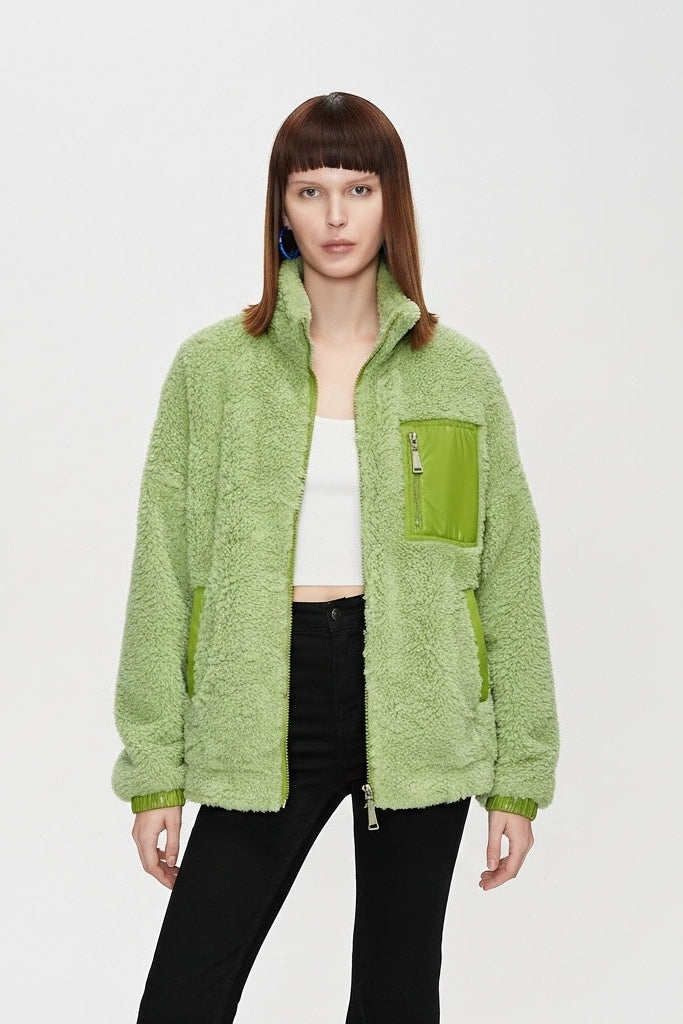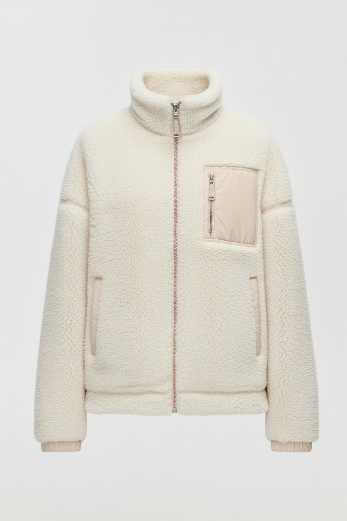 This jacket features a smooth wool-like exterior finished with clean panel stitching, creating a balanced contrast between casual coziness and polished autumn style. The high collar adds additional warmth while enhancing the jacket’s sculpted shape, ideal for breezy afternoons or layered city looks.