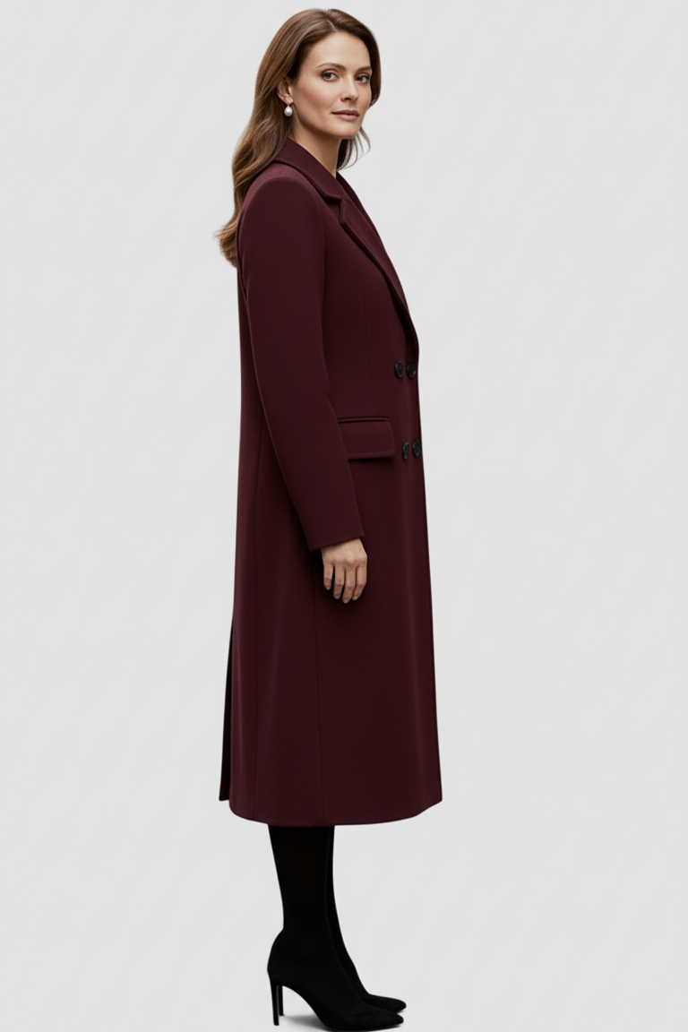The deep burgundy hue adds a touch of understated glamour, while its double-breasted tailoring and notched lapels sculpt a flattering, elongated silhouette. Designed to move with you, it’s the perfect fusion of structure and grace.