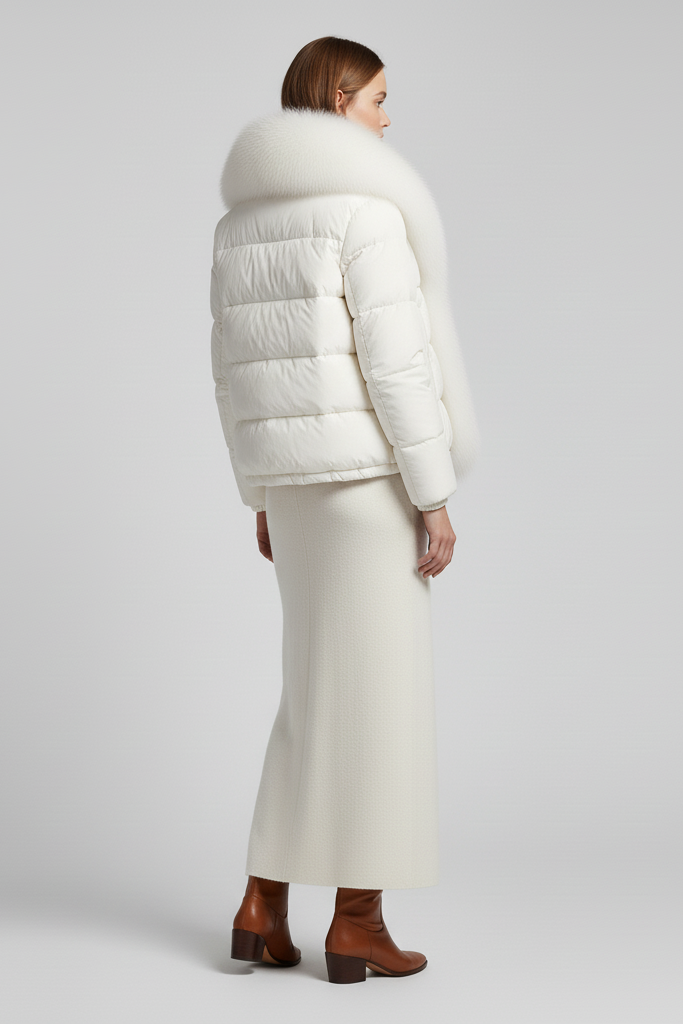The RAVELYN coat blends generous warmth with a strong winter silhouette, designed for women who want comfort without compromising elegance. The oversized natural raccoon fur collar adds volume, softness, and a luxurious frame around the face, while the short puffer structure keeps movement easy and modern.