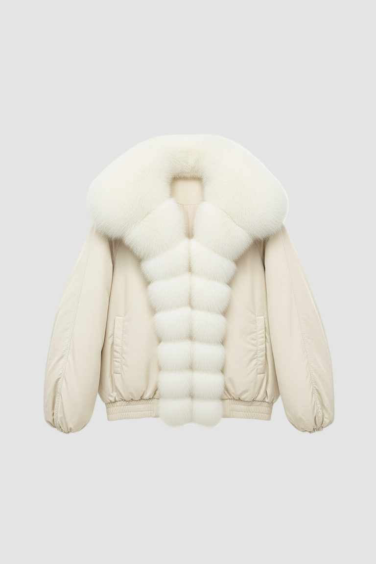 The Fox Fur Down Jacket VELORIA blends winter warmth with a refined, fashion-driven silhouette. Designed for women seeking softness, structure, and a touch of winter luxury, it features a detachable fox-fur tassel collar that instantly elevates its presence. The mid-length cut creates a balanced, elegant look, while the naturally woven shell enhances comfort and durability.