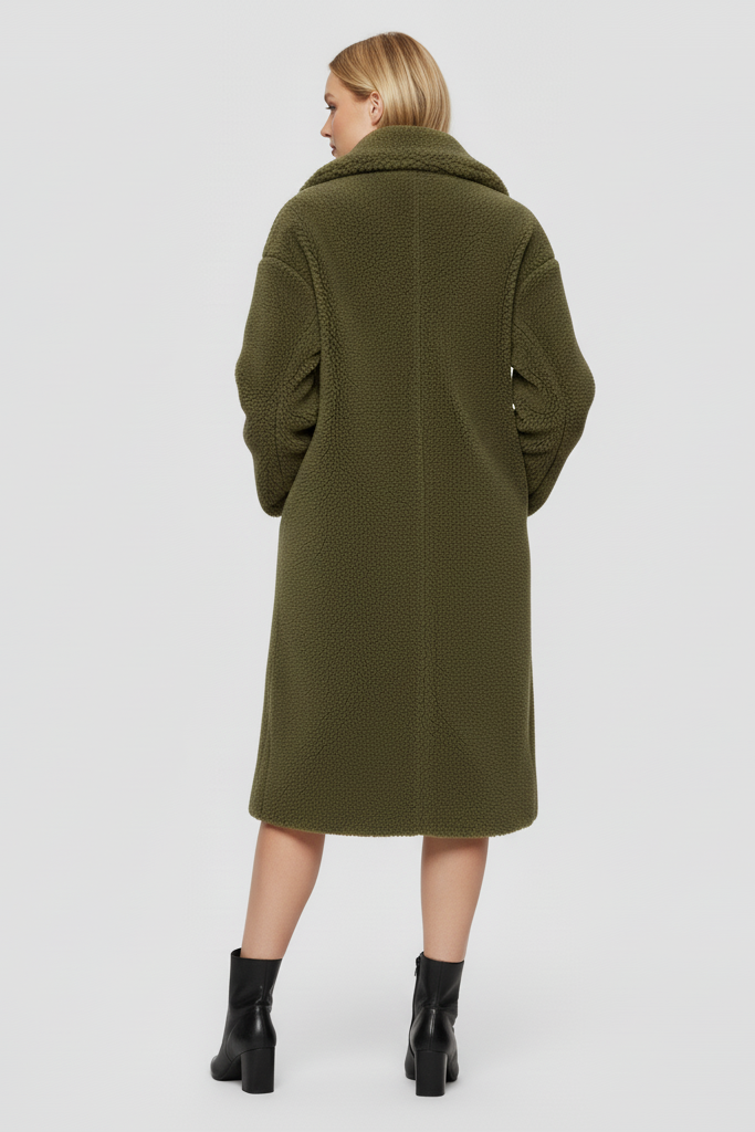 Its double-breasted closure, full-length sleeves, and classic turn-down collar create a refined winter look that pairs effortlessly with everyday outfits. The woven structure gives the coat durability and structure, while practical side pockets make it ideal for cold autumn and winter days.